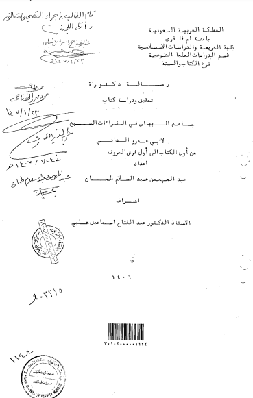 جامع البيان في القراءات السبع-عبدالمهين عبدالسلام طحان-جامعة ام القرى كلية الشريعه والدراسات الاسلاميه